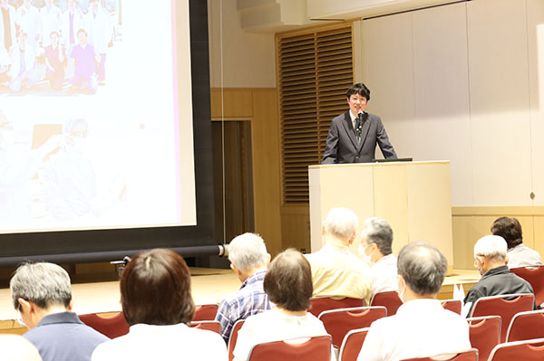 「健康長寿」とは、高齢者が自分の足で歩き健康的な生活を送れることをいいます。日本は世界の中で65歳以上の割合が最も高い国です。今後ますます高齢化が進む中、安心な老後を送るためにはどうすればいいのか。当院で「生活習慣病・がん対策外来」を担当している飛田医師による講演を行いました。