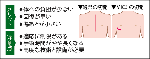 低侵襲手術(MICS)は、胸骨を部分的に切開する方法や、切開をせず肋骨の間からアプローチする方法などで行う心臓手術です。それぞれの方法に、メリットや注意すべき点があります。