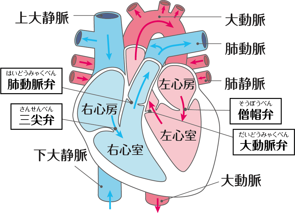 心臓には、血液の流れを一方通行に保つ「弁」が4つあります(大動脈弁・僧帽弁・三尖弁・肺動脈弁)。