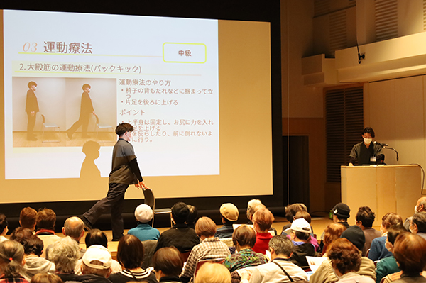 講演後半には、理学療法士による「膝を守る運動」をご紹介。